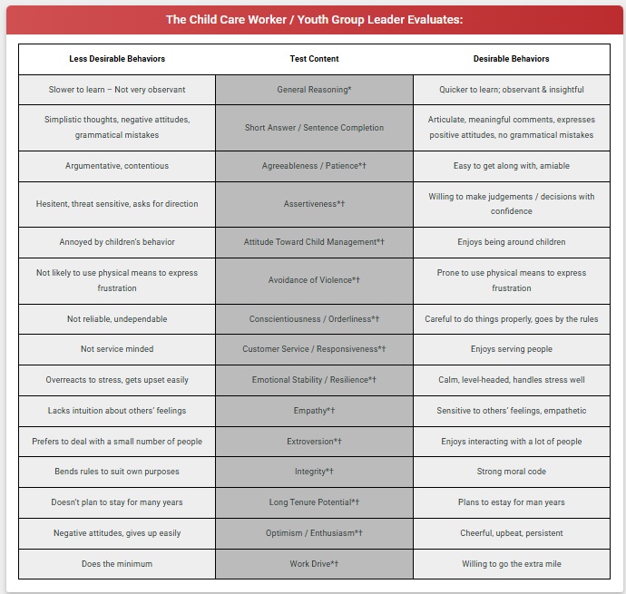 - Child Care Worker / Youth Group Leader – Personality Only (20 Min.) – A job-specific behavioral screener created for workers in education and daycare settings consisting of an untimed personality assessment targeting behaviors specific to this type of job.