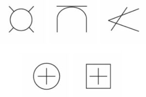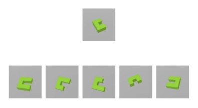 The Object Rotation subtest uses a classic format to represent people’s understanding of objects in three-dimensional space. Each Object Rotation item on the RIOT shows a target shape and five options. The examinee must identify which option is the same as the target shape after it has been rotated in two or three dimensions. An example of an Object Rotation item for the RIOT is shown below.