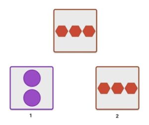 Abstract Matching is another test of processing speed that was described by Hale (1990). In this task, there is a target stimulus presented and two option images. The examinee must identify which of the two options more closely resembles the target stimulus. In the RIOT, the target stimulus is a collection of colored geometric shapes that have four characteristics: (1) shape, (2) color, (3) number, and (4) orientation. An example of Abstract Matching item for the RIOT is displayed below: