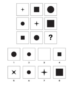 Items on the Matrix Reasoning subtest are designed to measure fluid intelligence with visual, geometric stimuli. In a matrix reasoning item, a series of images are shown in a 3 x 3 grid, with the bottom right image missing. The examinee must identify the pattern in the grid and identify which of eight options would complete the pattern. An example of a Matrix Reasoning item is here: