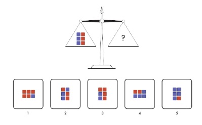 The final subtest that measures Fluid Reasoning is the Figure Weights subtest. This subtest measures abstract reasoning by asking examinees to discern the quantitative relationship among objects and to mentally manipulate that information to draw a conclusion about a new relationship. In the RIOT, Figure Weights items have one to four balance scales with a variety of shapes on them and the rightmost pan empty. The examinee must use the visual information to identify which of five options would balance out the final scale. An example of a Figure Weights item is here: