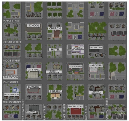Because of the unique graphic design needs, the Spatial Orientation subtest was the most difficult one to create for the RIOT. A series of maps were created to represent different types of geographic locations. Some of these were drawn by a graphic designer, and others were created by rendering a virtual environment into three dimensions and moving the “camera” to an overhead position to create two-dimensional maps. Text to accompany maps were written so that the items could ask examinees to interpret information in a map. The complexity of items was manipulated by adjusting the cues available in a map, adding obstacles to a navigation route, and asking for information that required interpreting information in two- or three-dimensions.