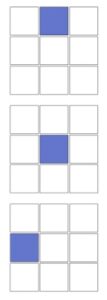 The final working memory task for the RIOT is the Visual Reversal subtest. In this task, examinees are shown a 3 x 3 grid of squares, eight of which are white and one of which is blue. At the rate of 1 per second, the square that is blue changes to white and a randomly selected white square changes to blue. After a series of color changes, a random grid of numbers is displayed. At that point, the examinee must report a sequence of numbers that corresponds to the reverse order that the squares changed color. An example of a Visual Reversal item is as follows:
