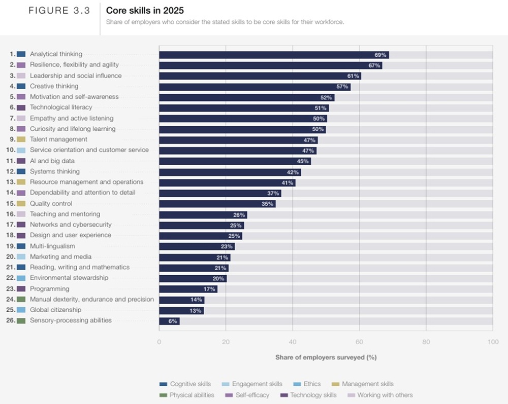Reimold has hit the nail on the head. The World Economic Forum’s The Future of Jobs Report 2025 from January of this year confirms her assertions. Their report encompasses the perspectives of over 1,000 employers representing more than 14 million workers across 22 industry clusters and 55 economies. Here’s what their respondents identified as core skills: