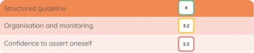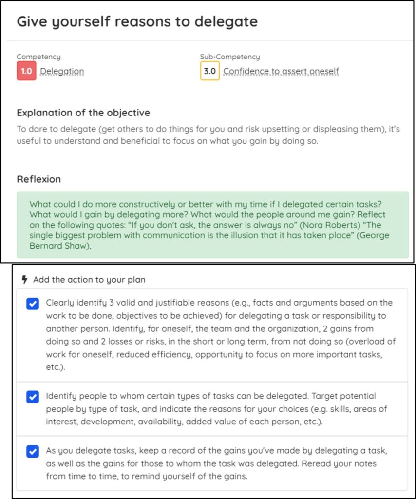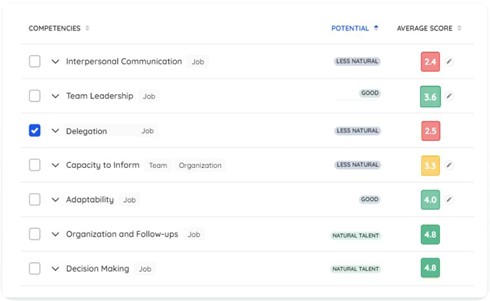 but the platform can show you that there are a few sub-competencies that support delegation, like structured guidance, organization and monitoring, and confidence to assert oneself. Structured guidance is a natural competency for this person, and their organization and monitoring competencies are developed, but not fully, and self-assertion is not a strength at all.